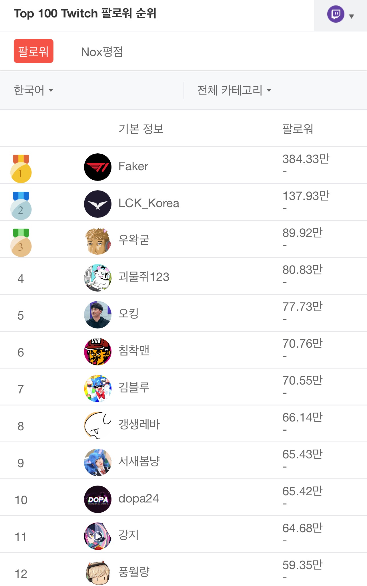 트위치는 유튜버 순위, 인스타 팔로워 순위와 다르게 변동성이 자주 발생하기에 직접 녹스인플루언서 라는 곳에서 실시간 랭킹 순위를 보시는게 정확합니다.