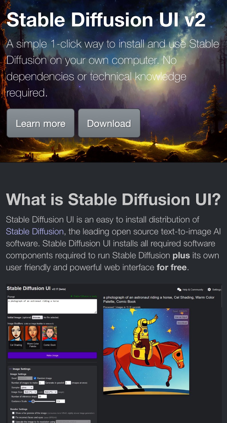 저는 복잡한걸 매우 싫어하기에 원클릭 다운으로 원클릭으로 설치 가능한 Stable diffusion ui 버전으로 하였습니다(홈페이지: https://github.com/cmdr2/stable-diffusion-ui 접속 후 가능)