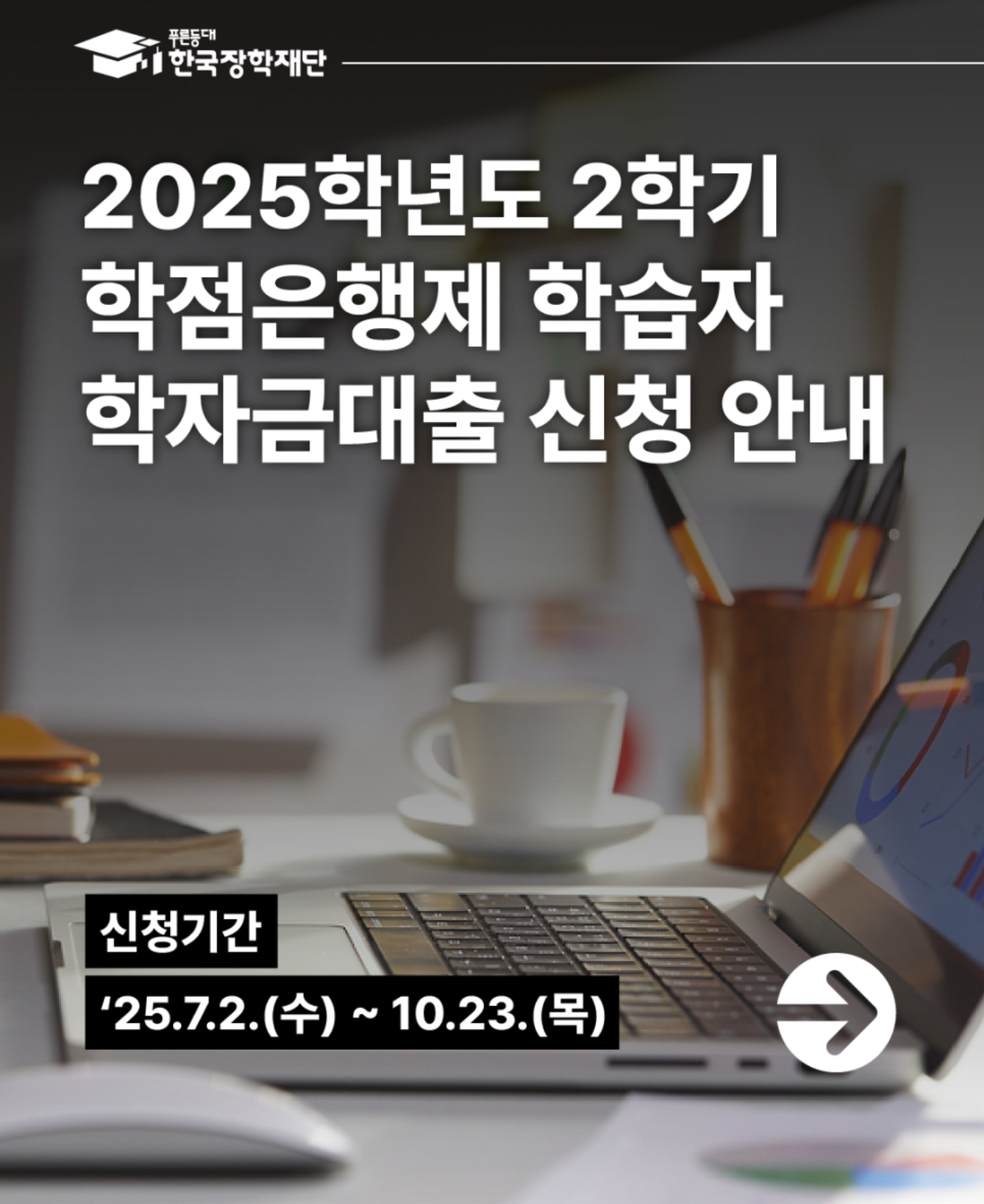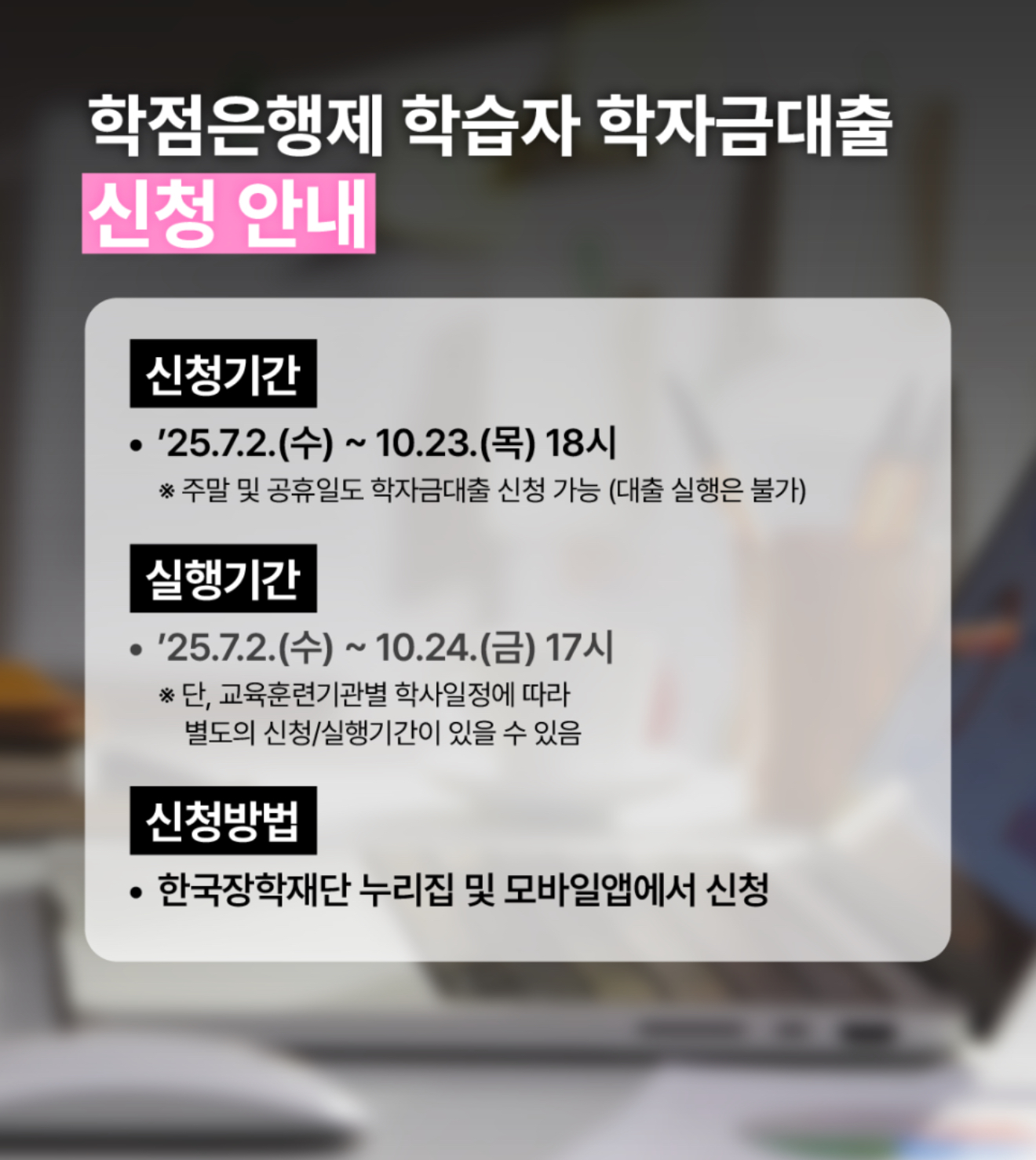 2025.7.2.(수)~ 2025.10.23.(목) 18시까지 학점은행제 학 습자 학자금대출 신청이 가능합니다.