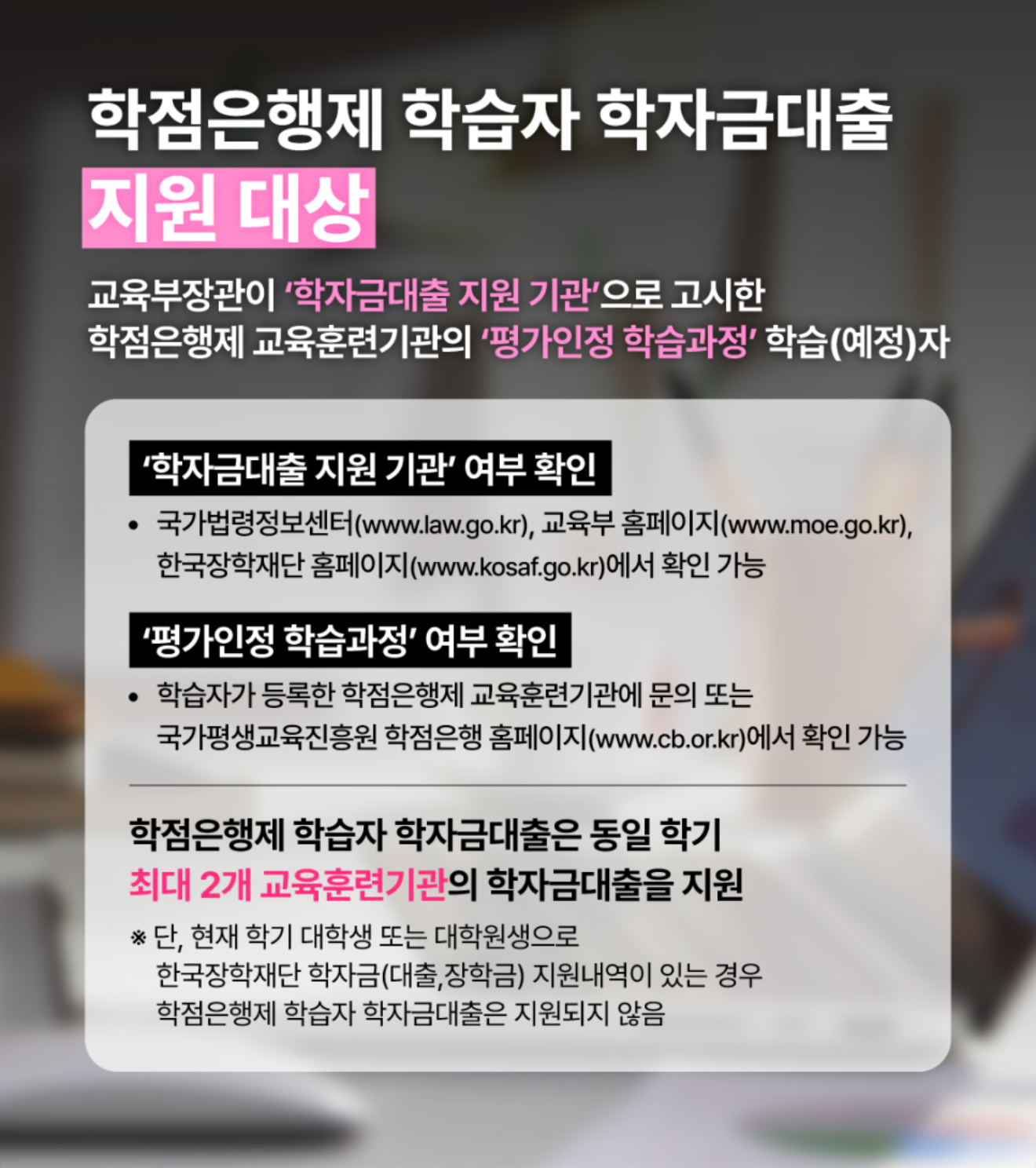 단, 현재 학기 대학생 또는 대학원생으로 한국장학재단 학자금 (대출, 장학금) 지원내역이 있는 경우, 학점은행제 학습자 학자 금대출은 지원되지 않으니 스스로의 학자금 지원내역에 대해 서 확인하시고 지원하시길 바랍니다.