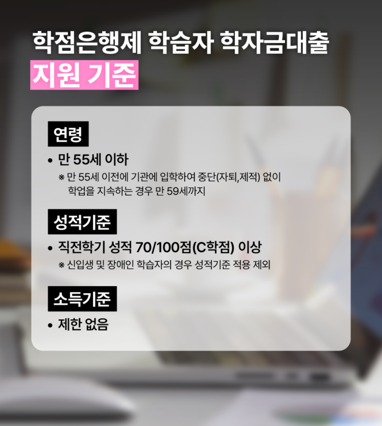 단, 만 55세 이전에 기관에 입학해 자퇴•제적 없이 계속 학업 지속하는 중이면 만 59세까지 가능합니다.
