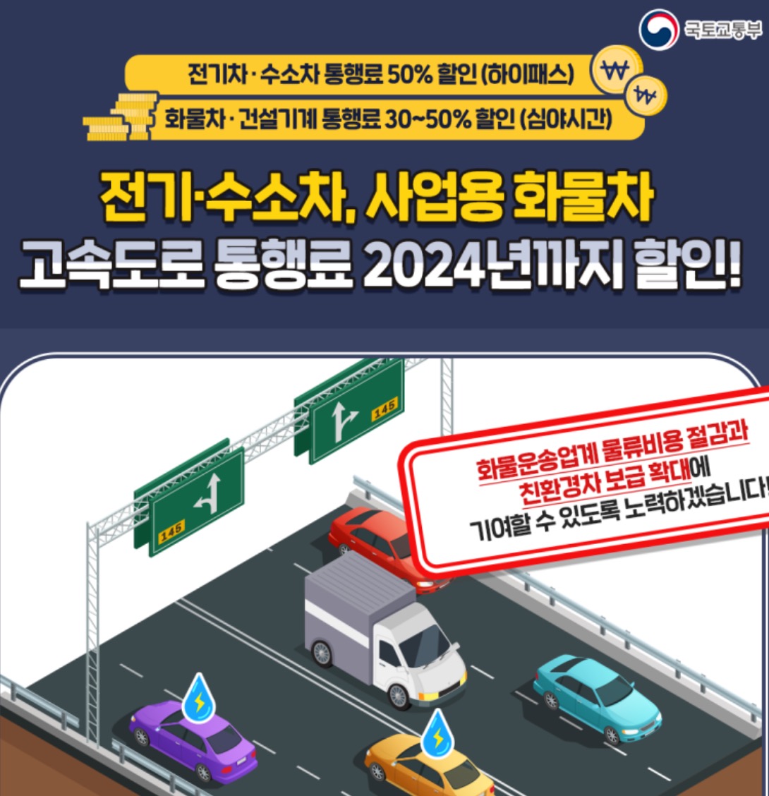 국토교통부는 2022년 12월 31일 종료 예정이던 사업용 화물차, 건설기계* 및 전기자동차, 수소전기자동차**에 대한 고속국도 통행료 할인제도를 2024년까지 2년 연장할 계획이라고 밝혔습니다.