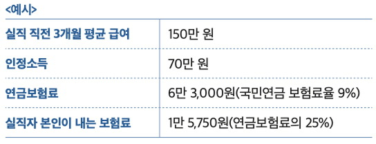 · 인정소득: 실직 전 3개월간 평균소득의 50%(최대 70만 원)