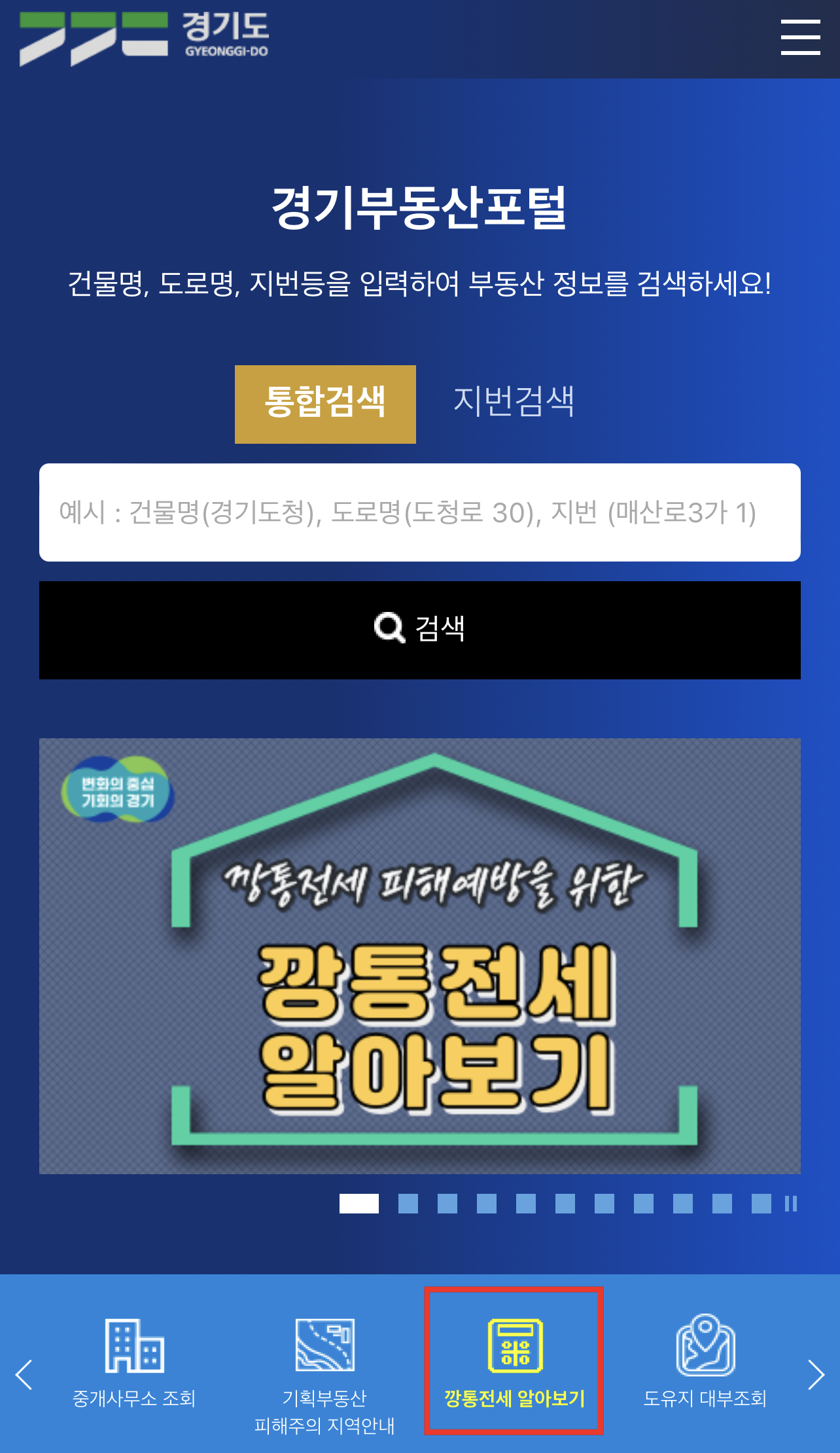 경기부동산포털 건물명, 도로명, 지번등을 입력하여 부동산 정보를 검색하세요! 통합검색 지번검색 통합검색 지번검색 검색