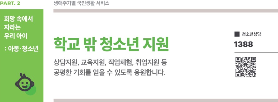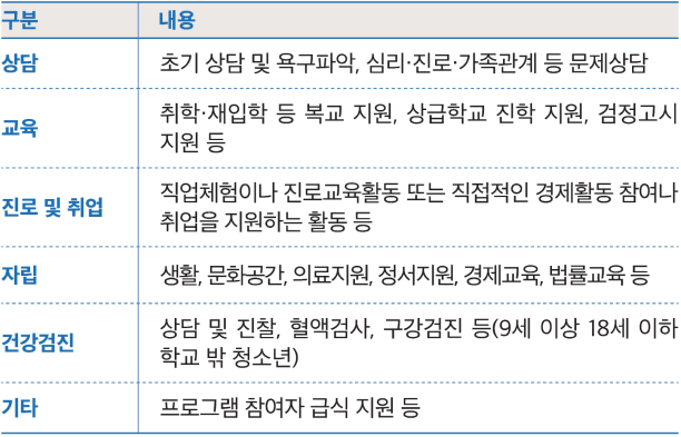 • 교육 : 취학·재입학 등 복교 지원, 상급학교 진학 지원, 검정고시 지원 등