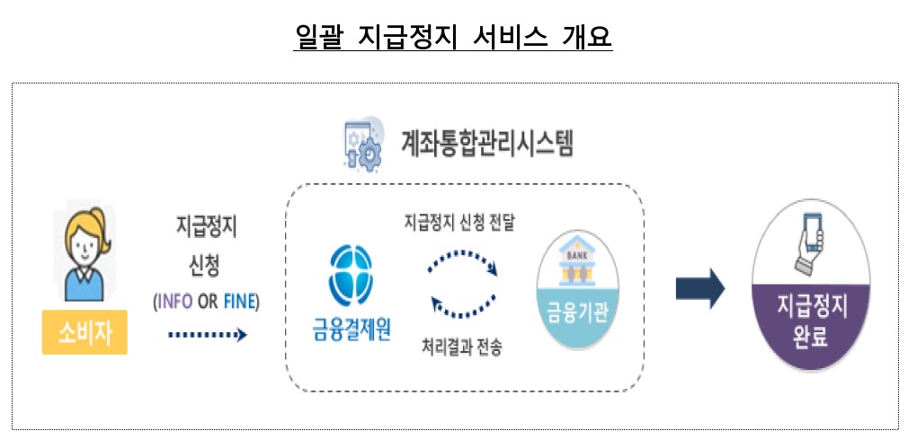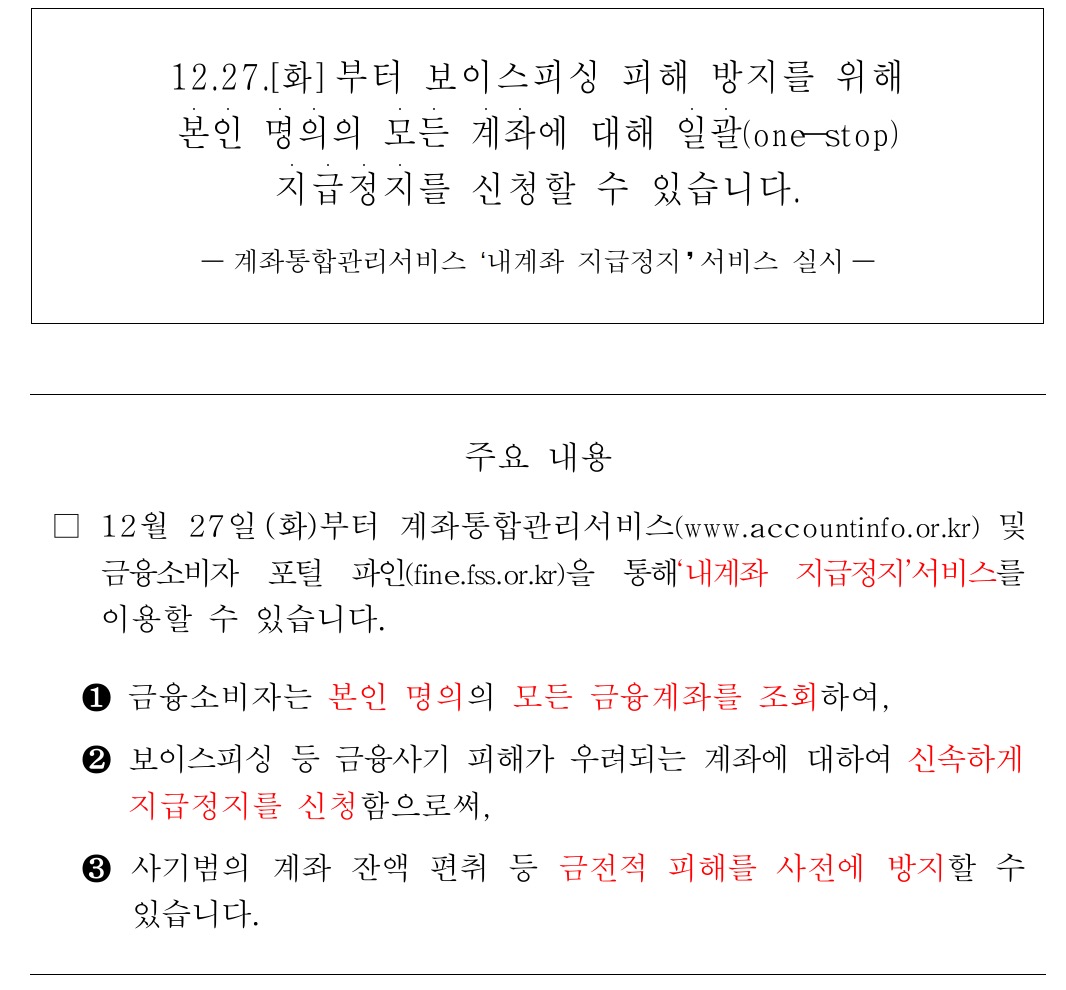 금융감독원은 금융결제원과 함께 2022년 12월 27일부터 계좌통합관리서비스 및 금융소비자 포털 파인을 통해 '내 계좌 지급정지' 서비스를 개시한다고 밝혔습니다.