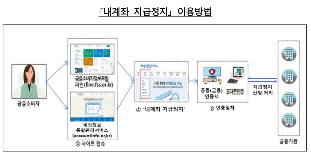 금융소비자가 계좌통합관리서비스(어카운트인포)의 “내 계좌 지급 정지”를 통해 본인 명의로 개설된 모든 금융계좌 현황을 일괄 조회하고, 보이스피싱 등 금융사기 피해가 우려되는 계좌를 선택(전체 또는 일부)하여 즉시 지급정지를 신청하는 서비스입니다.