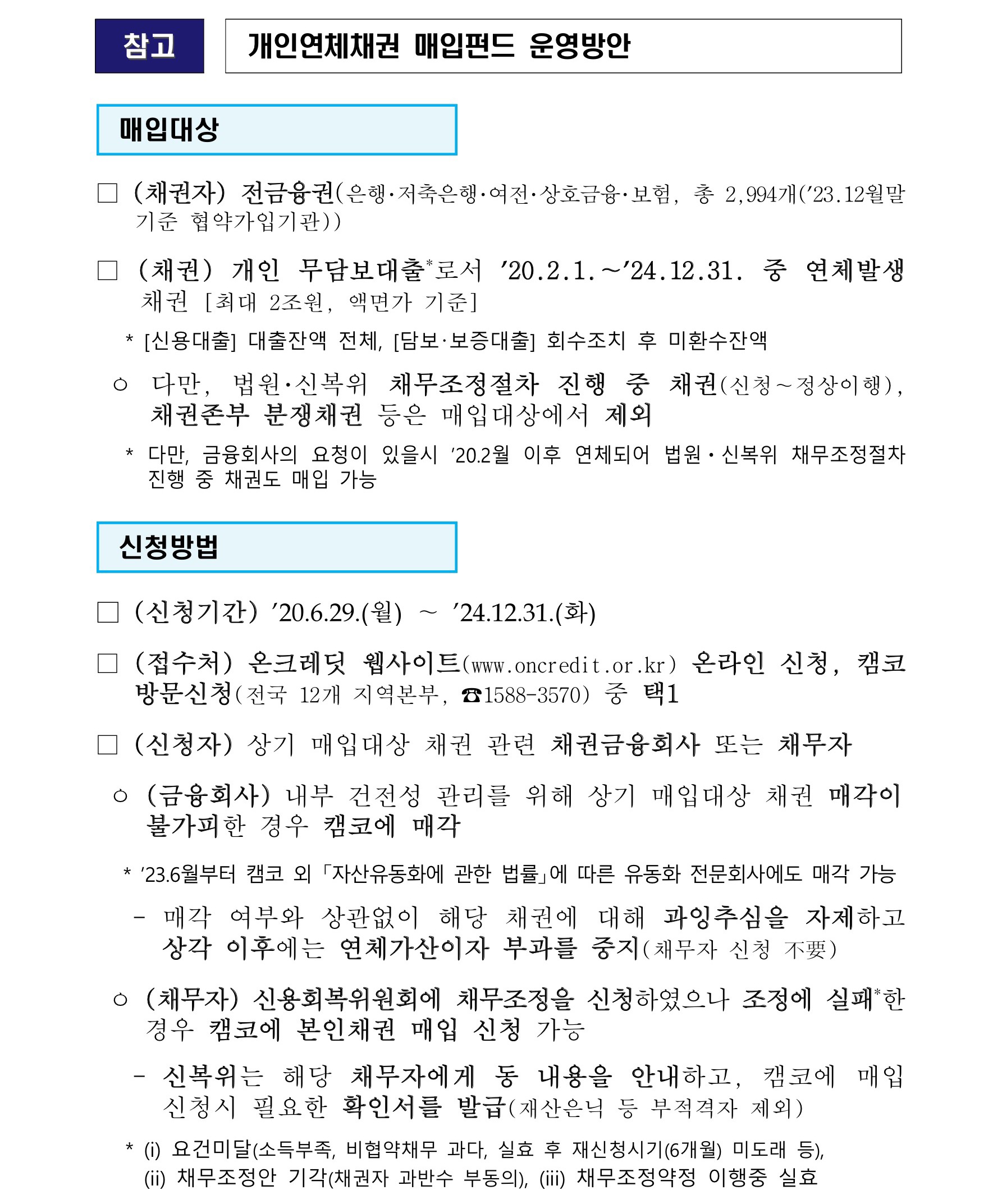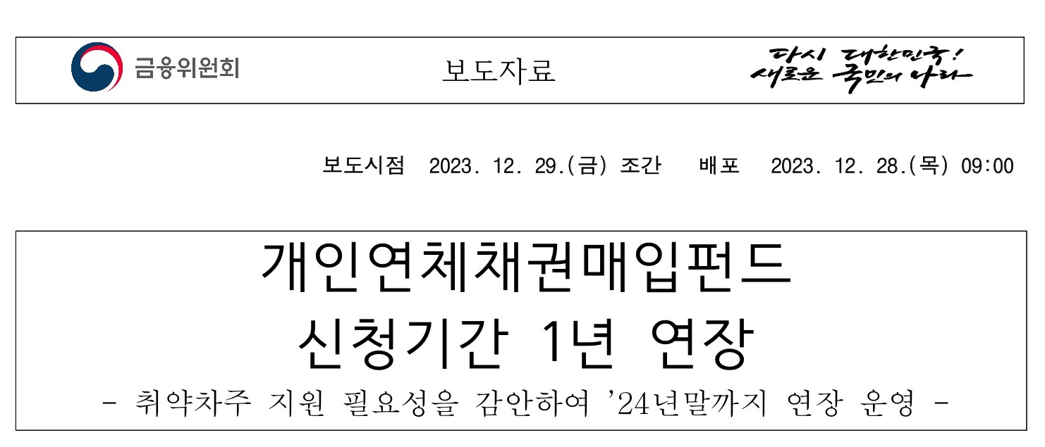 금융위원회와 관계기관, 全금융권은 최근 금리상승 등에 따른 취약차주 지원 필요성을 감안하여, 「개인연체채권 매입펀드」의 신청기간을 1년 연장하여 2024년 말까지 운영하기로 하였다고 합니다.
