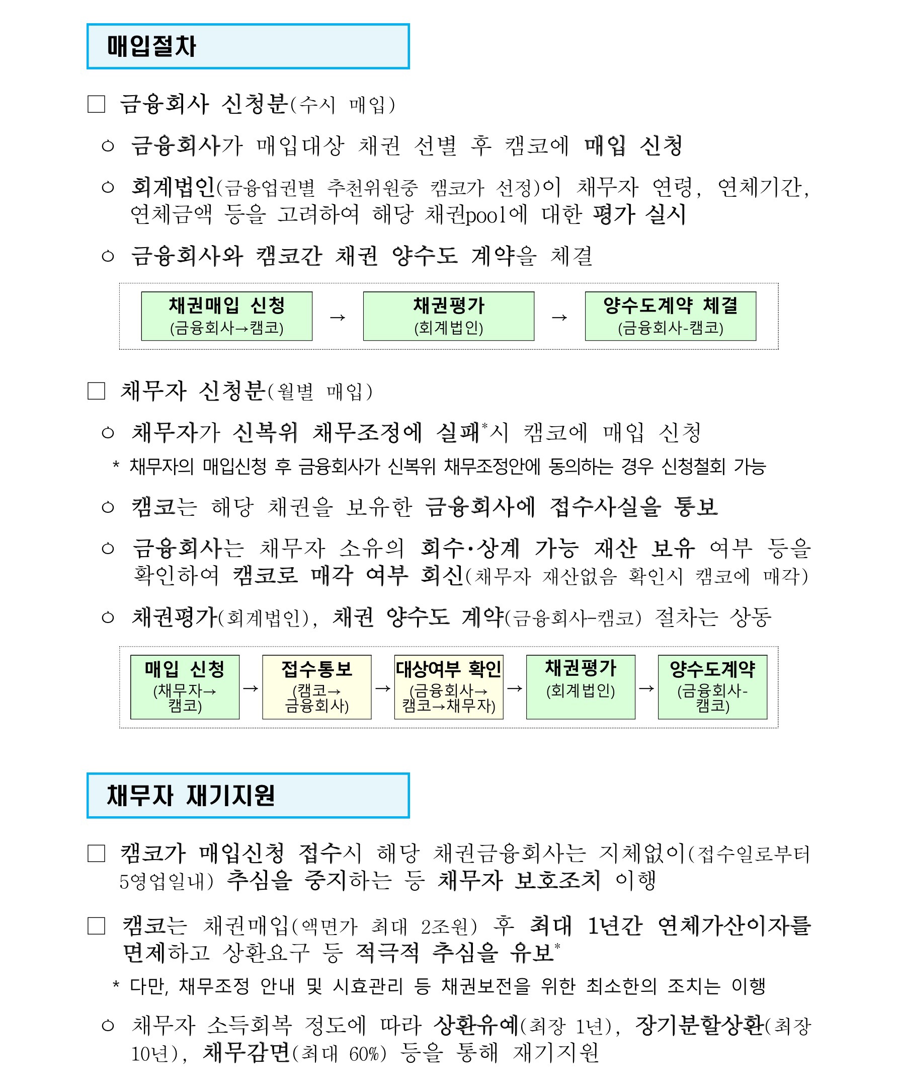금융위원회와 관계기관은 앞으로도 금융권과 함께 취약 개인채무자의 연체부담을 경감하고 정상적인 경제활동으로의 복귀를 지원하기 위해 필요한 정책방안을 지속 검토해 나가겠다고 밝혔습니다.
