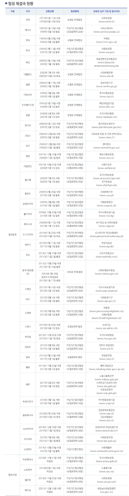 ③ 캐나다(´99. 5. 1 발효), 미국(´01. 4. 1 발효), 독일(´03. 1. 1 발효), 헝가리(´07. 3. 1 발효), 프랑스(´07. 6. 1 발효), 호주(´08. 10. 1 발효), 체코(´08. 11. 1 발효), 아일랜드(´09. 1. 1 발효), 벨기에(´09. 7. 1 발효), 폴란드· 슬로바키아· 불가리아(‘10. 3. 1 발효), 루마니아(‘10. 7. 1 발효), 오스트리아(‘10. 10. 1 발효), 덴마크(’11. 9. 1 발효), 인도(’11. 11. 1 발효), 스페인(’13. 4. 1 발효), 터키(‘15. 6. 1 발효), 스웨덴(’15. 6. 1 발효), 브라질(’15. 11. 1 발효), 핀란드(’17. 2. 1 발효), 퀘벡(’17.9.1 발효), 페루(’19.1.1 발효), 룩셈부르크(’19.9.1 발효), 슬로베니아(’19.10.1 발효), 크로아티아(’19.11.1 발효), 우루과이(’21.11.1 발효), 뉴질랜드(’22.3.1 발효)와의 협정이 가입기간 합산협정에 해당합니다.