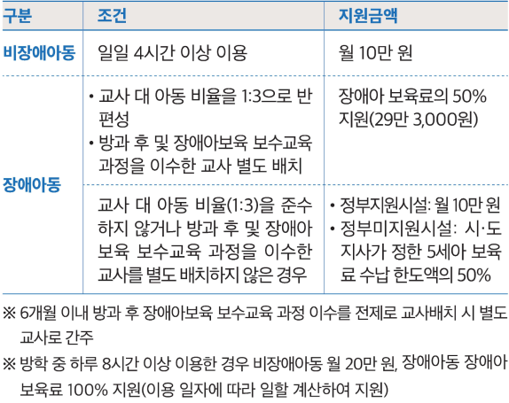 ※ 방학 중 하루 8시간 이상 이용한 경우 비장애아동 월 20만 원, 장애아동 장애아 보육료 100% 지원(이용 일자에 따라 일할 계산하여 지원)