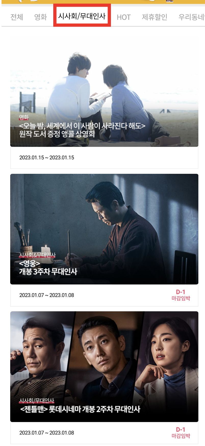 2. 시사회 및 무대인사 탭을 들어가시면 이렇게 다양항 정보도 하눈에 볼 수 있으니 잘 참고해보시길 바랍니다.
