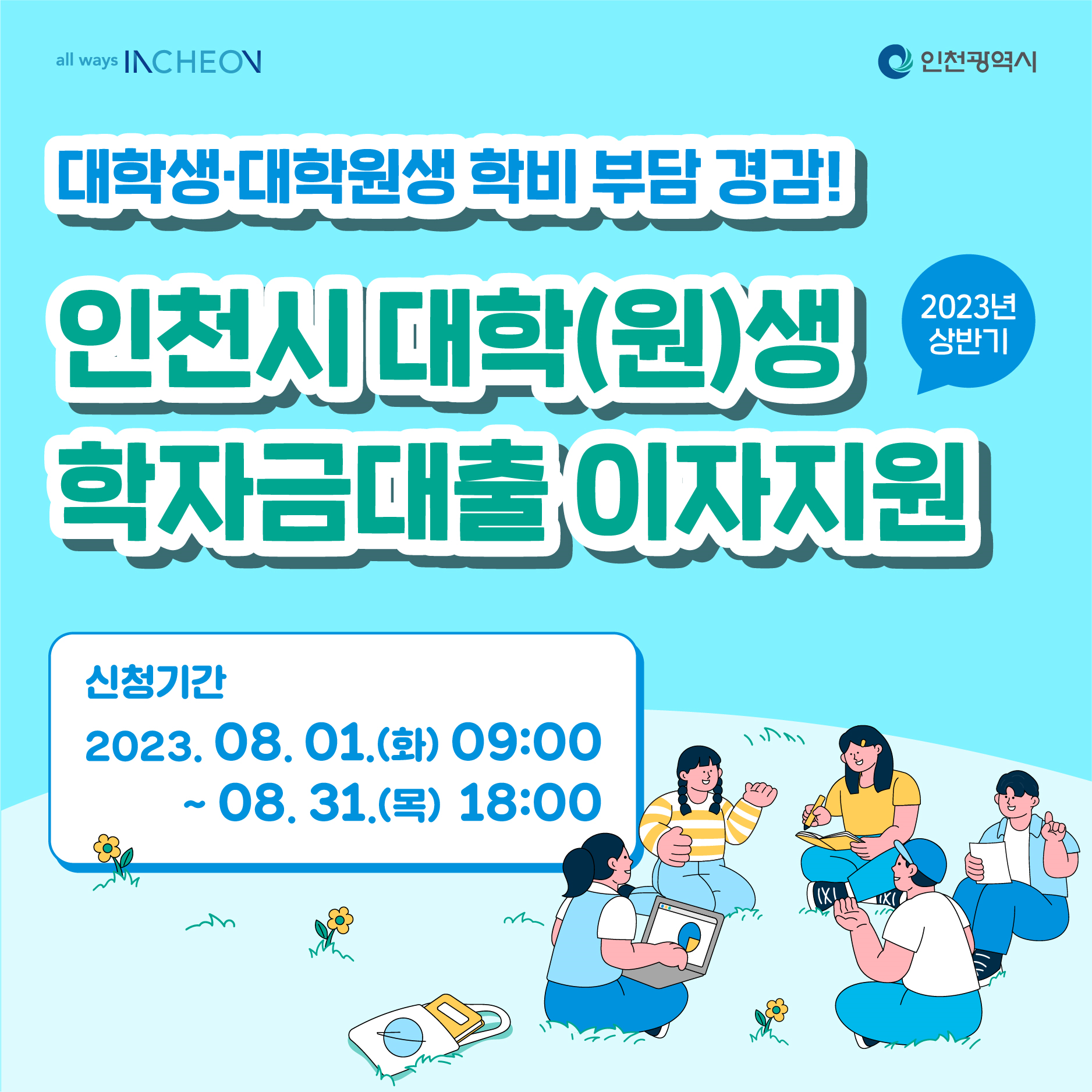 인천광역시(시장 유정복)는 한국장학재단에서 대출받은 대학(원)생 학자금대출의 이자 지원신청을 내달 2023년 8월 1일부터 31일까지 한 달간 접수 받는다고 밝혔습니다.