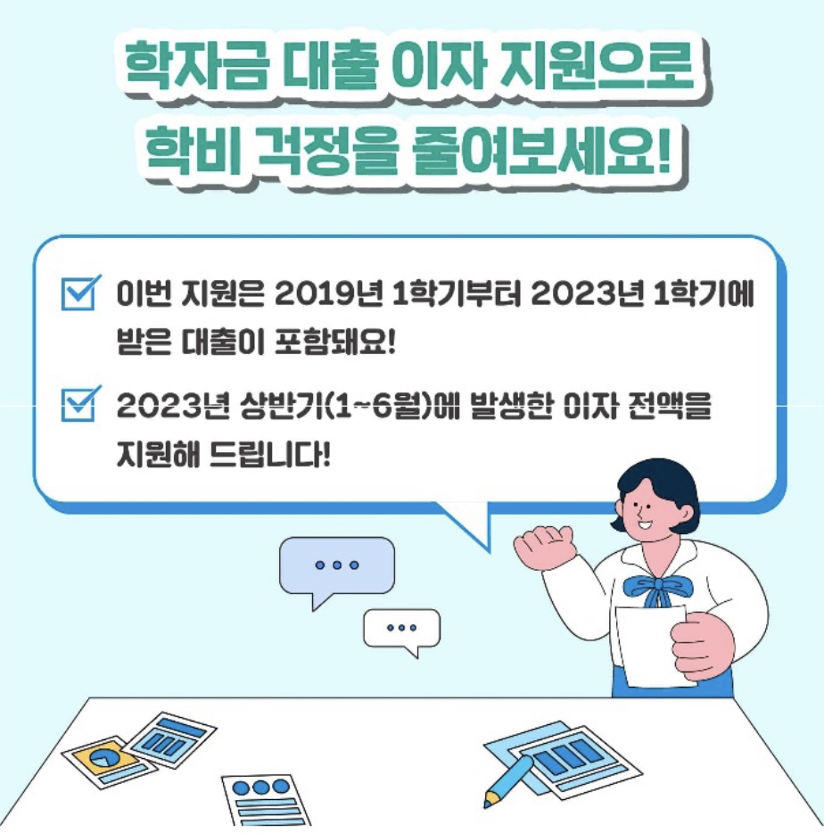 2019년 1학기부터 2023년 1학기까지 대출받은 학자금의 올 상반기(2023년 1월부터 6월까지) 발생한 이자 전액이 지원됩니다.