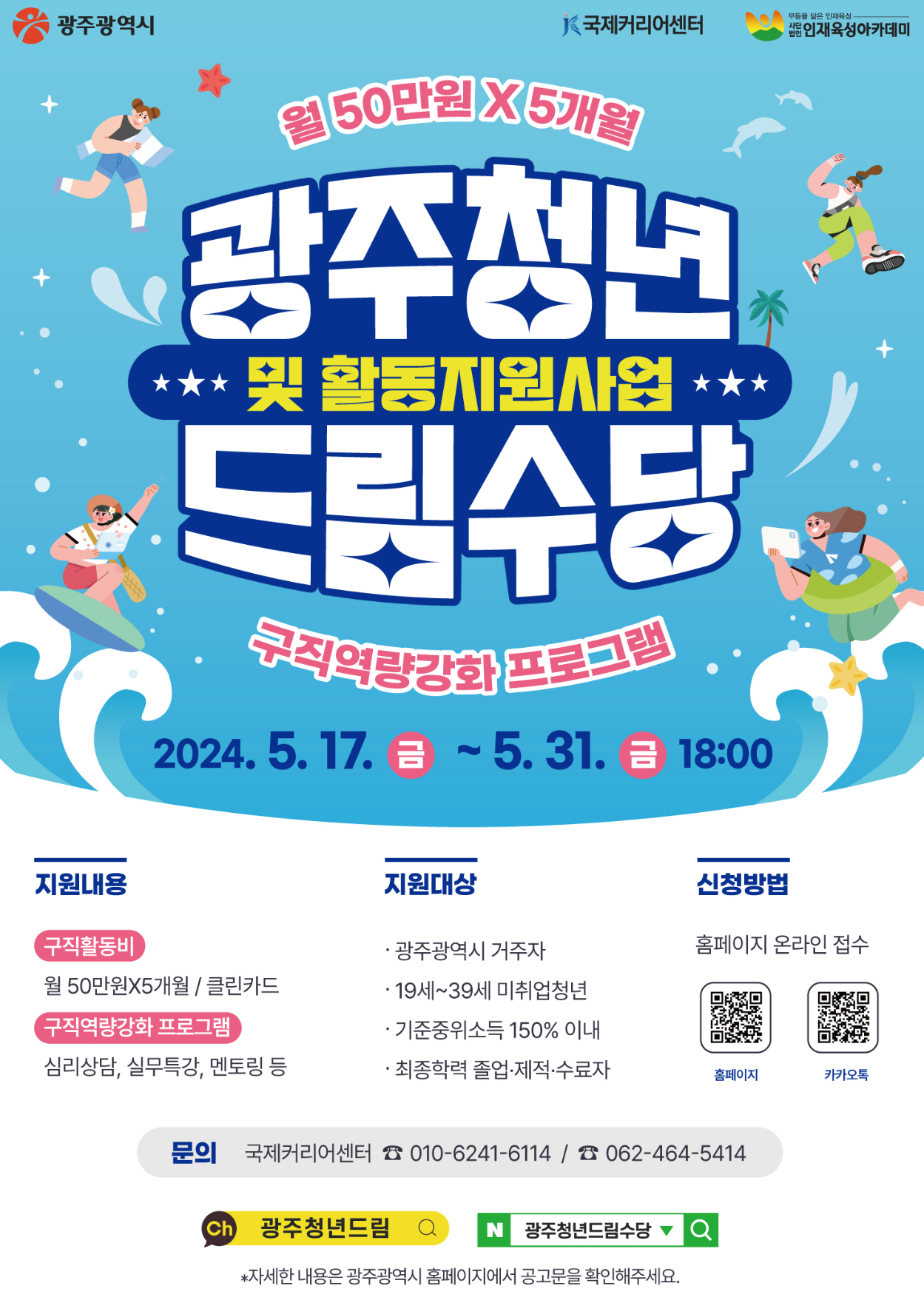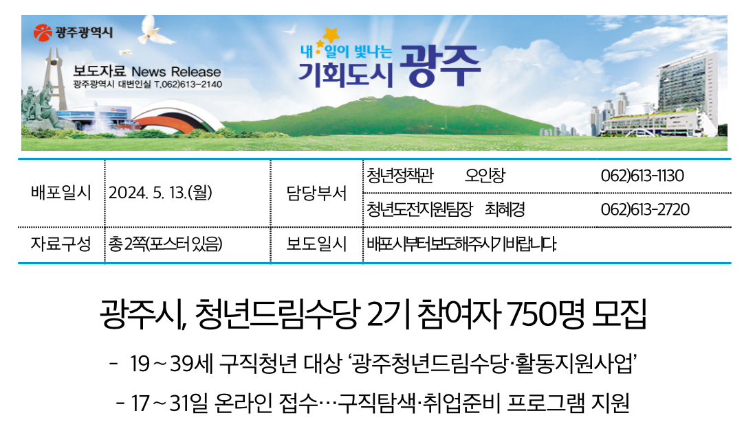 광주광역시(시장 강기정)는 미취업 청년의 지역사회 진입을 돕고 구직활동에 필요한 경비를 지원하기 위해 ‘2024 광주청년드림수당 및 활동지원’ 2기 참여자를 오는 2024년 5월 31일까지 모집한다고 밝혔습니다.