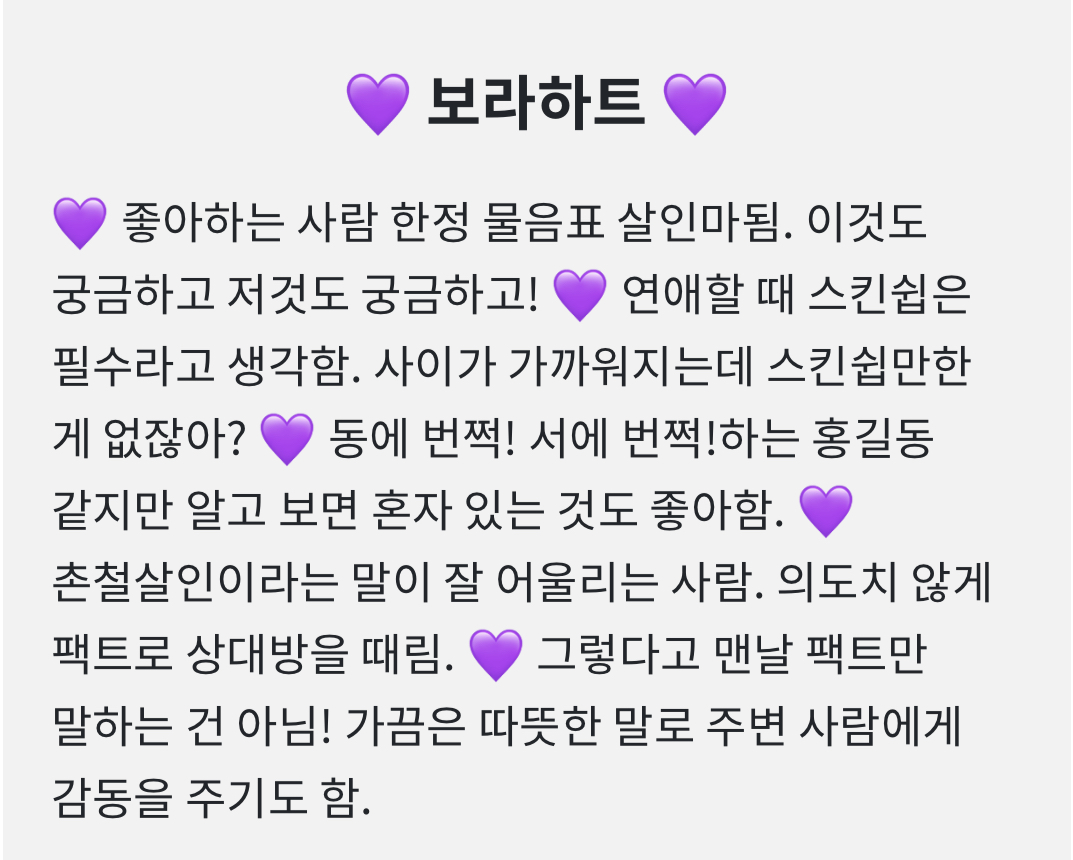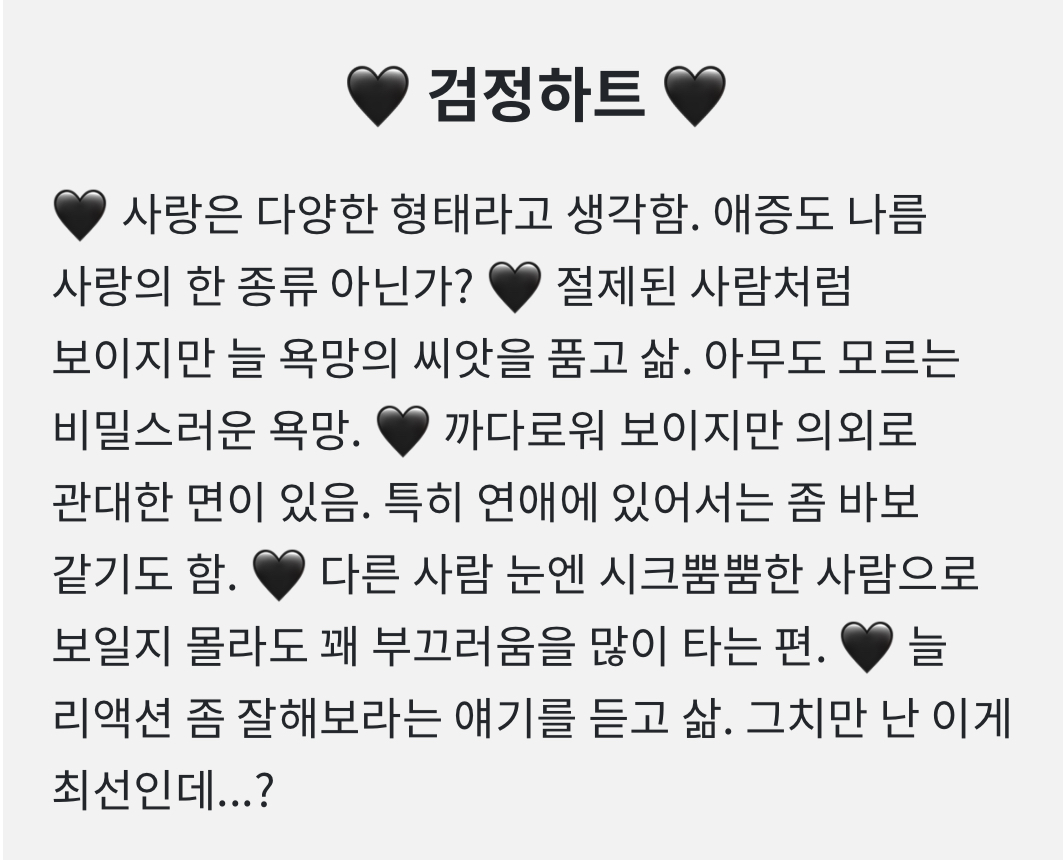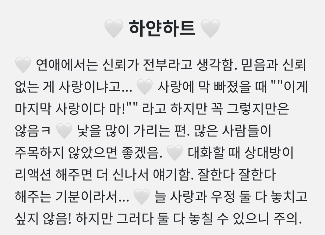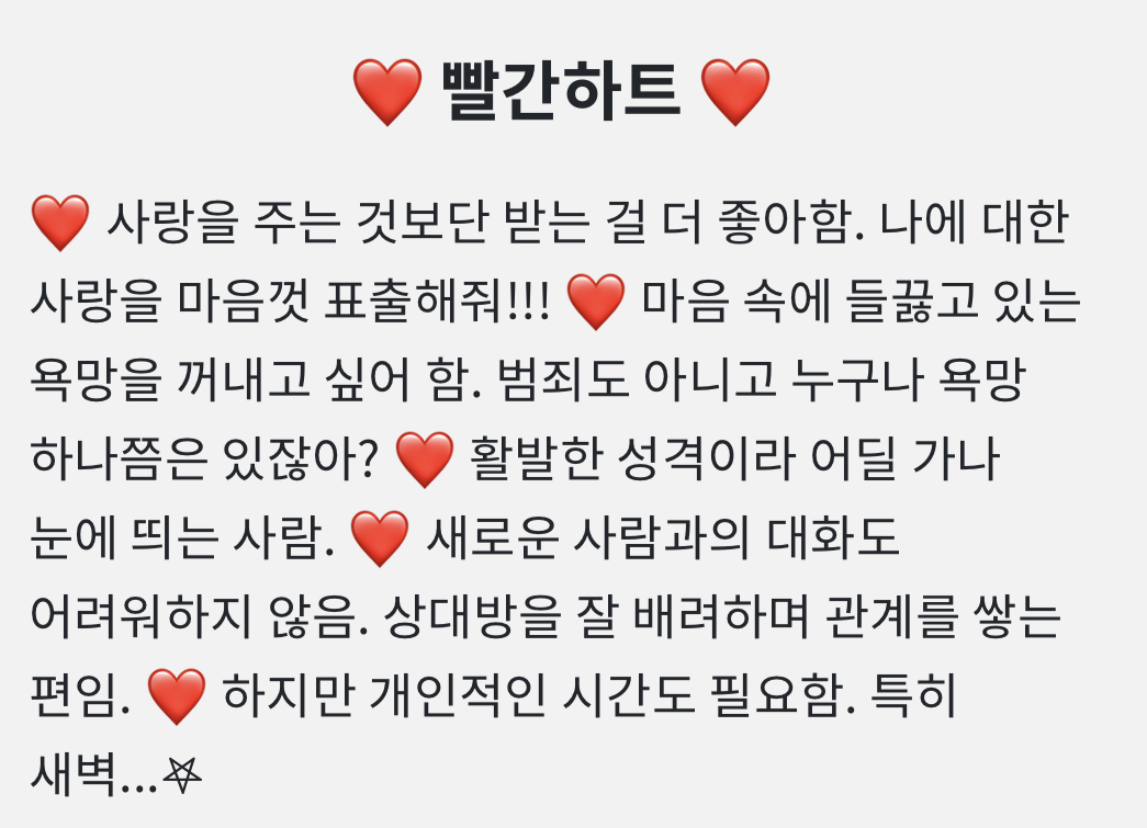 - 사랑을 주는 것보단 받는 걸 더 좋아함. 나에 대한 사랑을 마음껏 표출해줘!!!