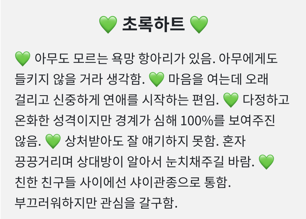 하트 이모지 테스트를 진행하면 당신의 결과와 하트 색깔별 의미를 알려주는데 그 내용은 다음과 같습니다.