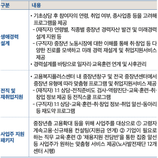 중장년층 고용확대 등을 위해 사업주를 대상으로 ① 고령자 계속고용·신규채용 컨설팅(지원금 연계) ② 기업이 필요로 하는 교육·훈련 ③ ‘채용지원 전담반’을 통한 전직 지원 등 사업주가 원하는 맞춤형 서비스 제공(노사발전재단 12개 센터 시행)
