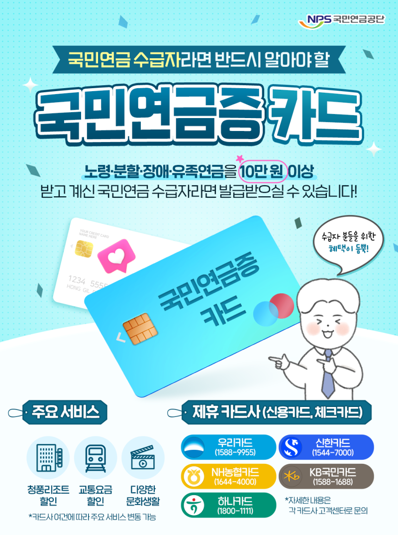 국민연금 수급자분들을 위한 교통, 문화 등 다양한 혜택이 마련되어 있는 국민연금증 카드를 소개해드리겠습니다.