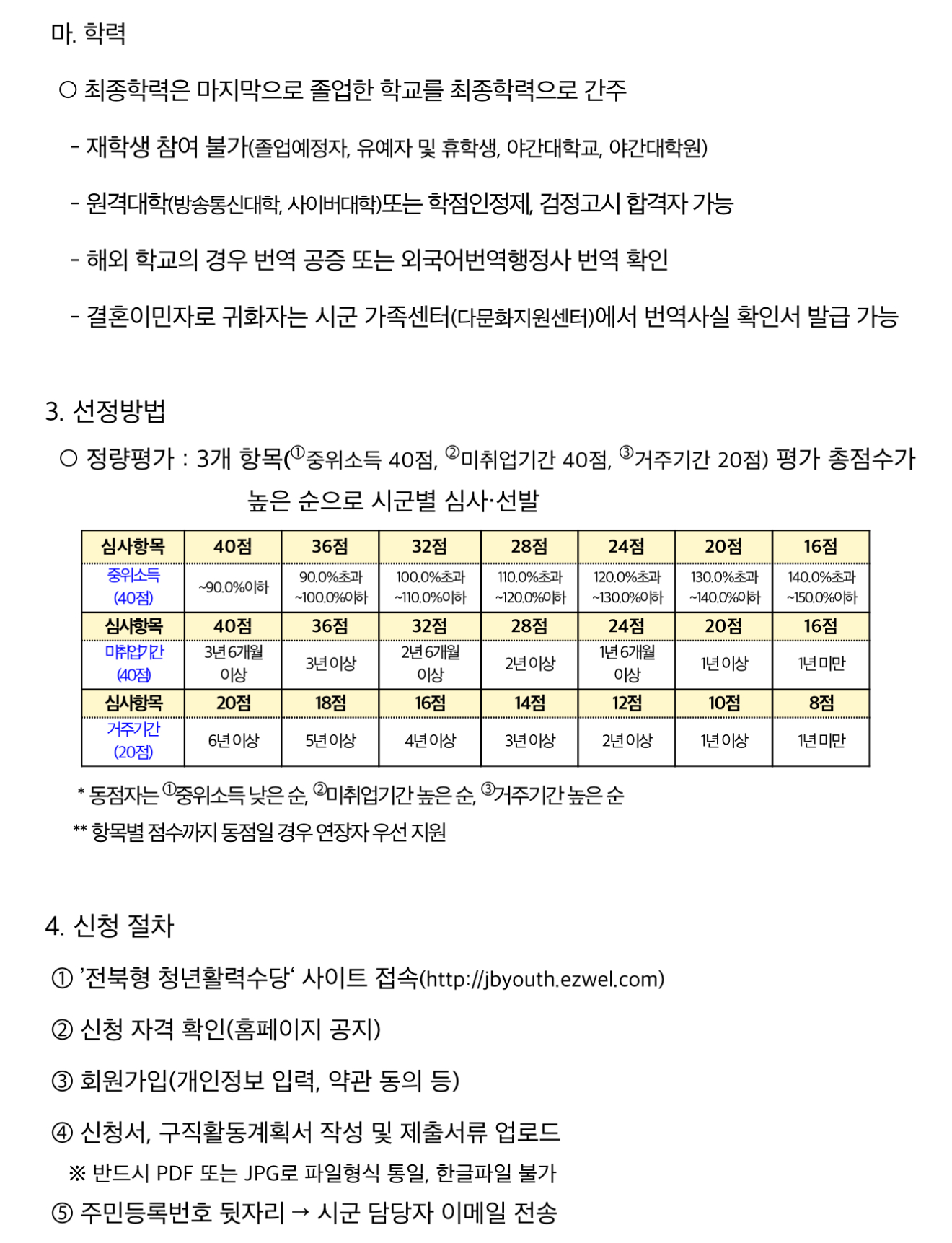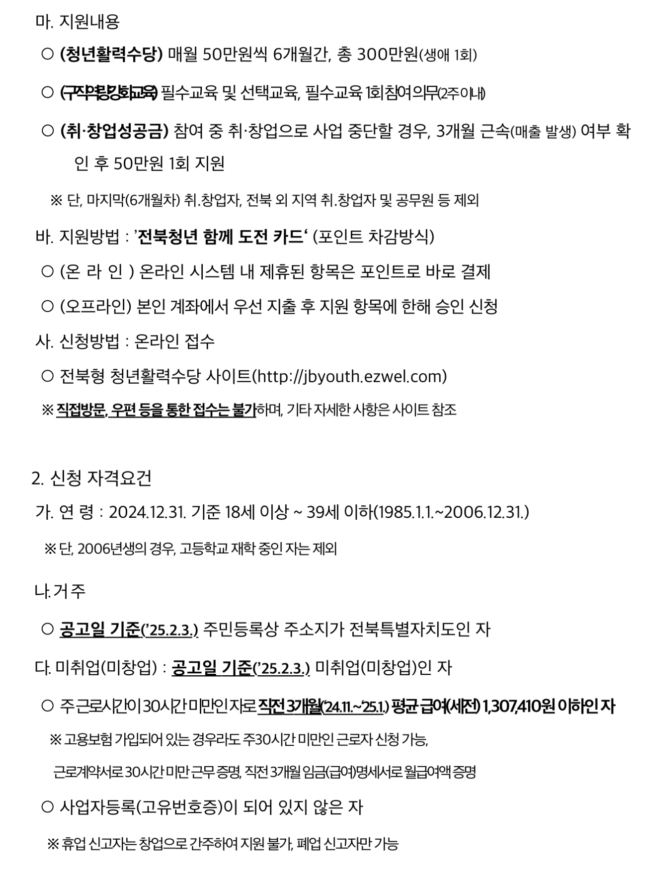 전북형 청년활력수당 지원사업에 신청을 희망하는 대상은 △도내 거주 중인 18~39세 미취업 청년으로 △가구 중위소득 150% 이하 청년이어야 하고 △공고일 기준 주민등록상 전북에 1년 이상 거주해야 합니다.