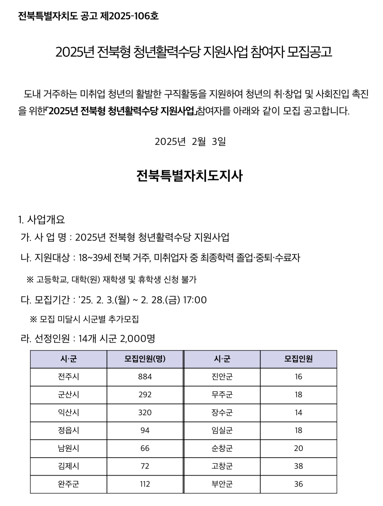 선발 인원은 총 2000명으로 시군별 인원으로는 전주 884명, 군산 292명, 익산 320명, 정읍 94명, 남원 66명, 김제 72명, 완주 112명, 진안 16명, 무주 18명, 장수 14명, 임실 18명, 순창 20명, 고창 38명, 부안 36명입니다.