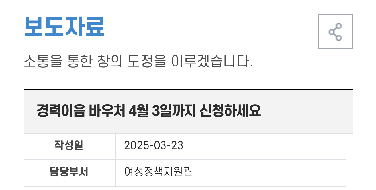 경력이음 바우처는 일자리 지원사업의 1단계로 경력단절여성의 구직활동에 필요한 교육비, 면접 준비 비용 등을 생애 1회, 50만 원 바우처 카드 포인트로 지원하는 사업입니다.