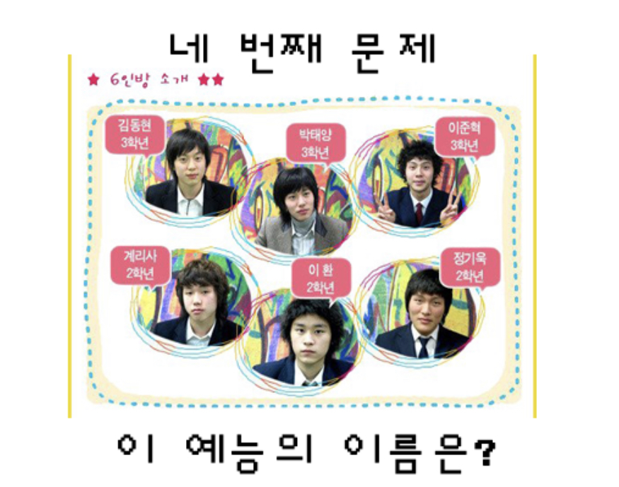 4. 김동현 3학년, 박태양 3학년, 이준혁 3학년, 계리사 2학년, 이환 2학년, 정기욱 2학년이 나오는 이 예능의 이름은?