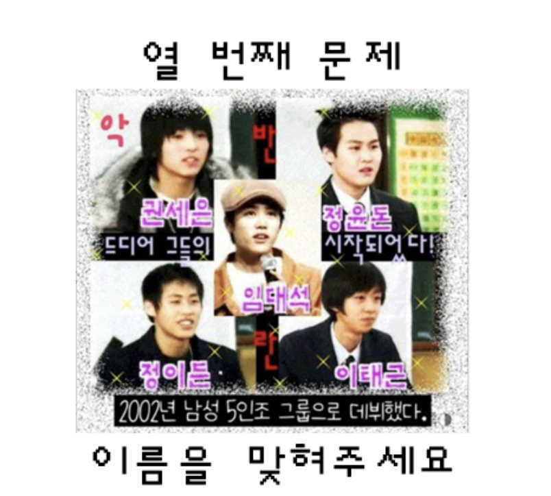 10. 권세은, 정윤돈, 임대석, 정이든, 이태근이 나오는 2002년 남성 5인조 그룹으로 데뷔한 이름을 맞혀주세요