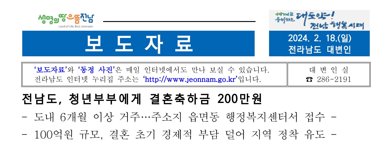 전라남도는 청년의 결혼 초기 경제적 부담을 덜어주고 지역 정착을 유도하기 위해 총 100억 원 규모의 청년부부 결혼축하금을 지원한다고 밝혔습니다.