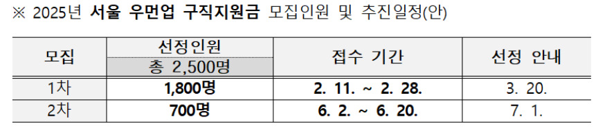 1차 모집은 2025년 2월 11일부터 2월 28일까지 서울우먼업 프로젝트 누리집(https://swup.seoulwomanup.or.kr/swm/employment/main.do)을 통해 온라인으로 신청을 받는다며 2차 모집은 6월에 있을 예정이라고 합니다.