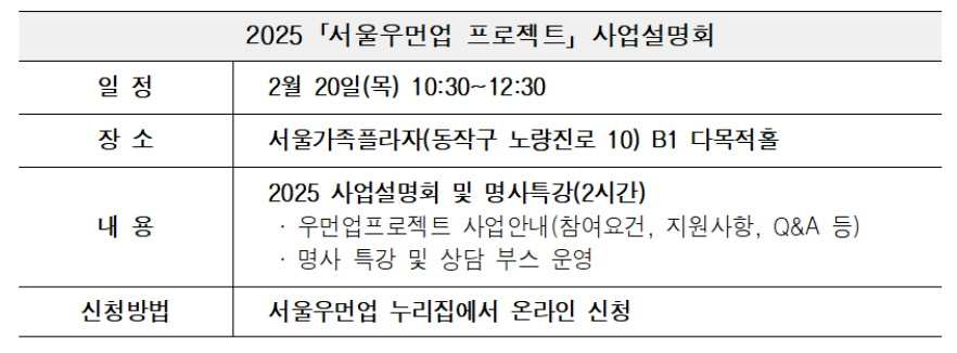 사업에 대한 궁금증 해소와 지원서류 작성 등 도움을 받고 싶다면 사업설명회에서 자세한 내용을 들을 수 있는데 2025년 2월 20일 서울가족플라자에서 진행되며, 온라인으로 신청하면 됩니다.