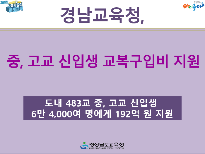 경남교육청은 교육 복지 사업의 연속성을 확보하고 학부모 혼란을 줄이고자 「경상남도교육청 학교 교복 지원 조례」를 신속하게 제정해 학생 약 6만 4,000여 명에게 교복 구입비 192억 원을 지원한다고 합니다.