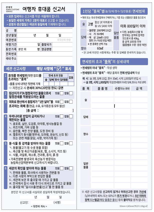 우리나라에 입국하는 모든 여행자와 승무원은 인적사항, 신고대상물품을 소지하였는지와 그 취득가격을 신고서에 기재하고 여행자 서명란에 직접 서명한 후 세관장에게 제출해야 합니다.