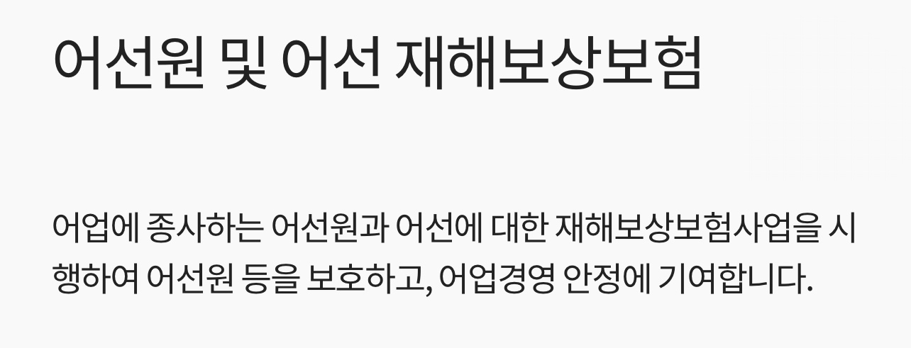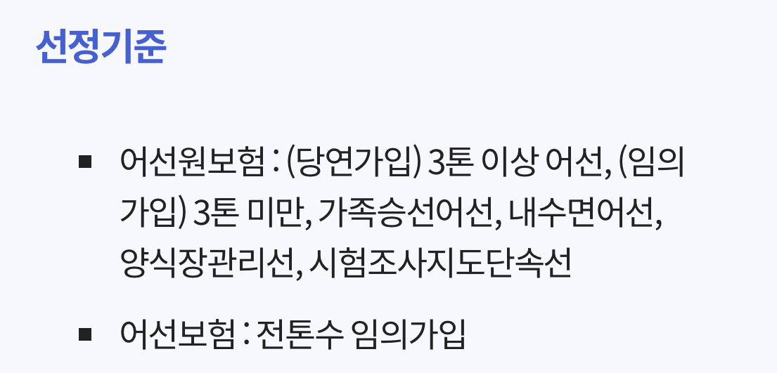 • 어선원보험 : (당연가입) 3톤 이상 어선, (임의가입) 3톤 미만, 가족승선어선, 내수면어선, 양식장관리선, 시험조사지도단속선