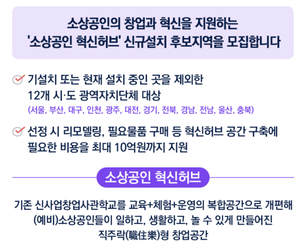 소상공인 혁신허브 신규 후보 선정 시 리모델링, 필요물품 구매 등 혁신허브 공간 구축에 필요한 비용을 최대 10억원까지 지원하고, 소통의 장이 될 수 있는 다양한 문화 프로그램 및 단계별 창업 프로그램을 운영하게 됩니다.