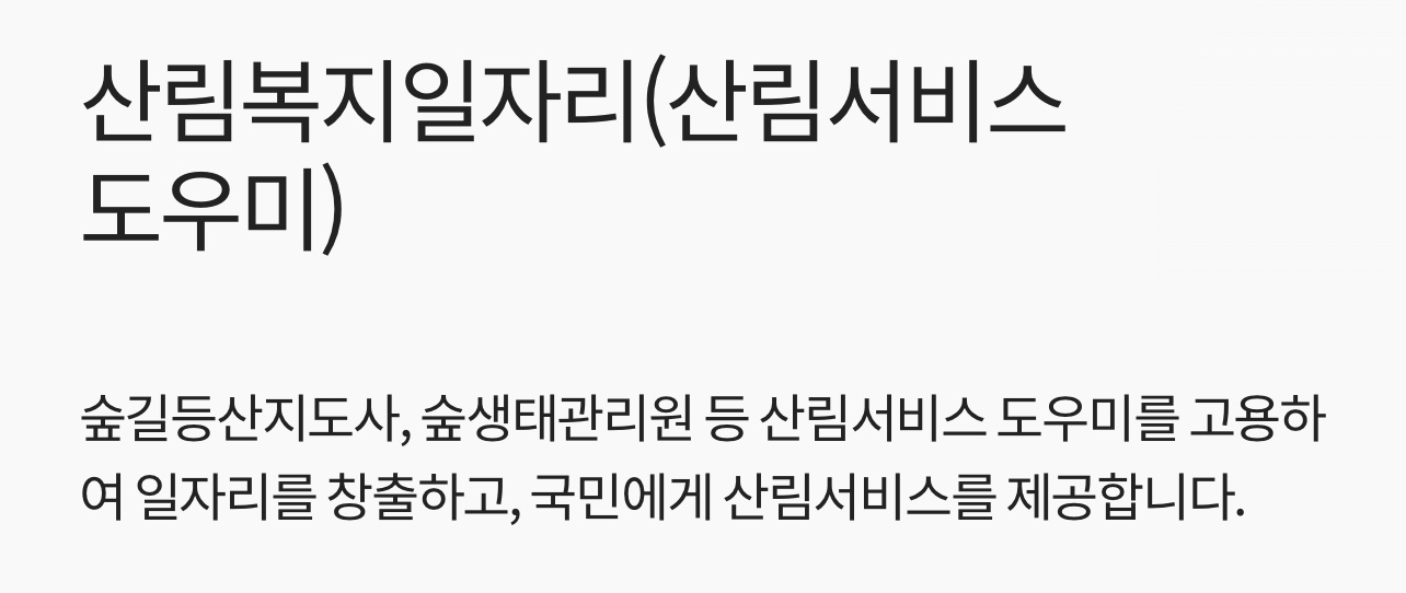 소관부처 산림청에 따르면 숲길등산지도사, 숲생태관리원 등 산림서비스 도우미를 고용하여 일자리를 창출하고, 국민에게 산림서비스를 제공한다고 합니다.