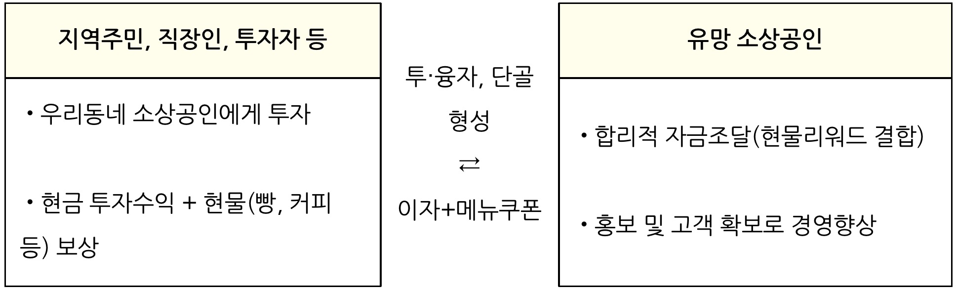 참고로 주민들이 동네 소상공인 크라우드 투자시 현금수익+현물 리워드를 결합하여 고객확보 유도한다고 합니다.