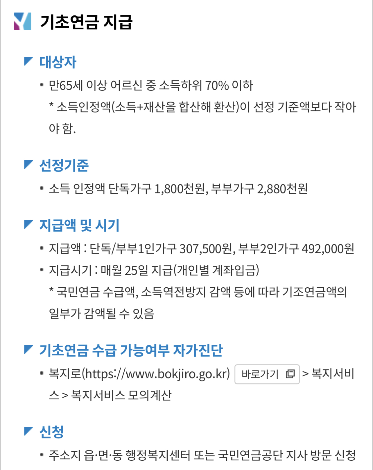• 기초연금 수급 가능여부 자가진단: 복지로(https://www.bokjiro.go.kr) > 복지서비스 > 복지서비스 모의계산