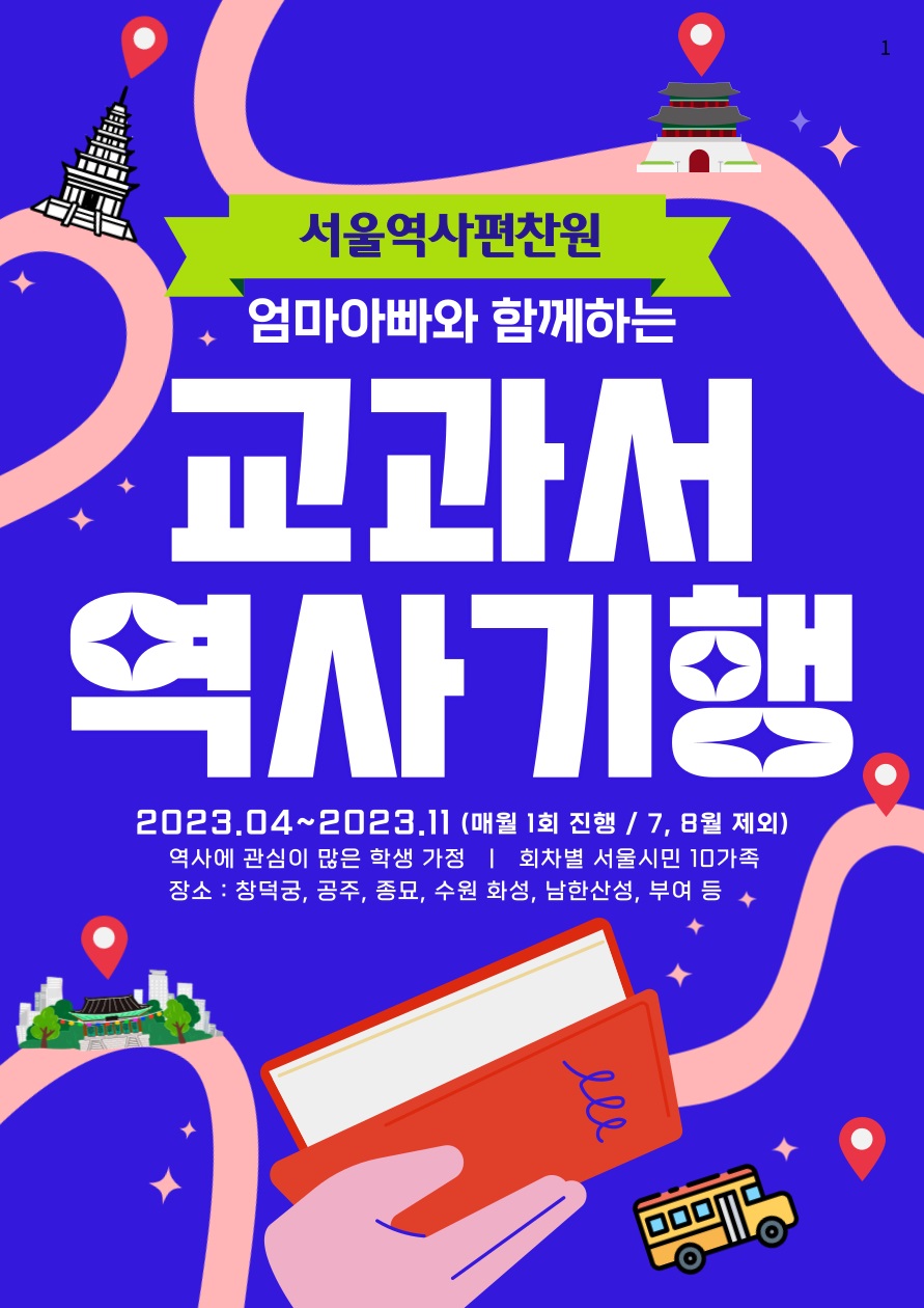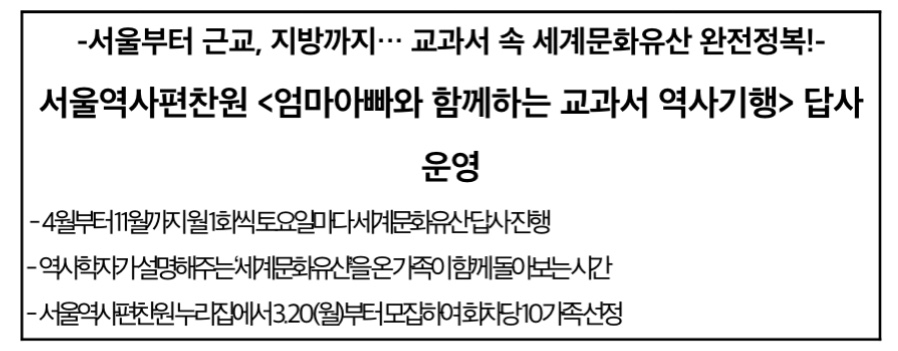 서울역사편찬원(원장 이상배)은 새로운 답사 프로그램인 ‘엄마 아빠와 함께하는 교과서 역사기행’(이하 교과서 역사기행)을 마련하고 참여자를 모집한다고 밝혔습니다.