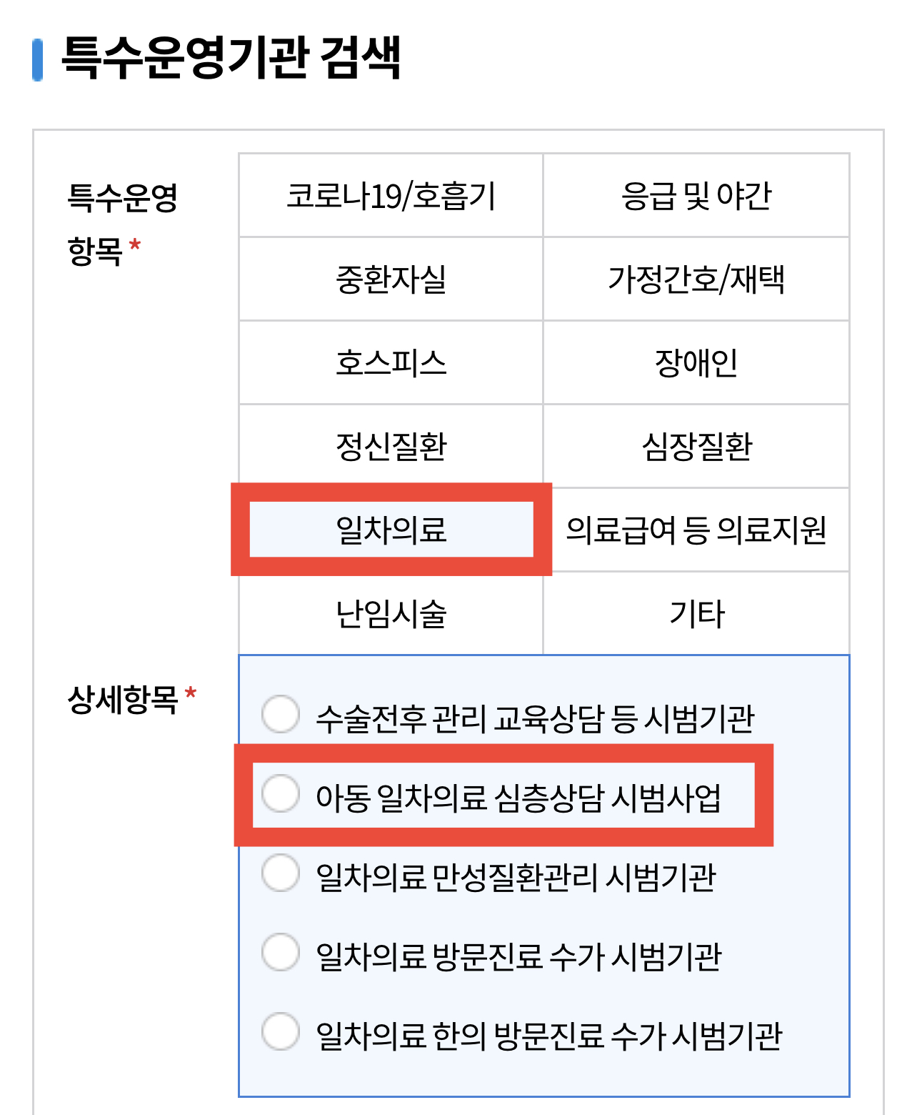 특수운영항목에 일차의료 선택 후 아동 일차의료 심층상담 시범사업을 클릭하시길 바랍니다.