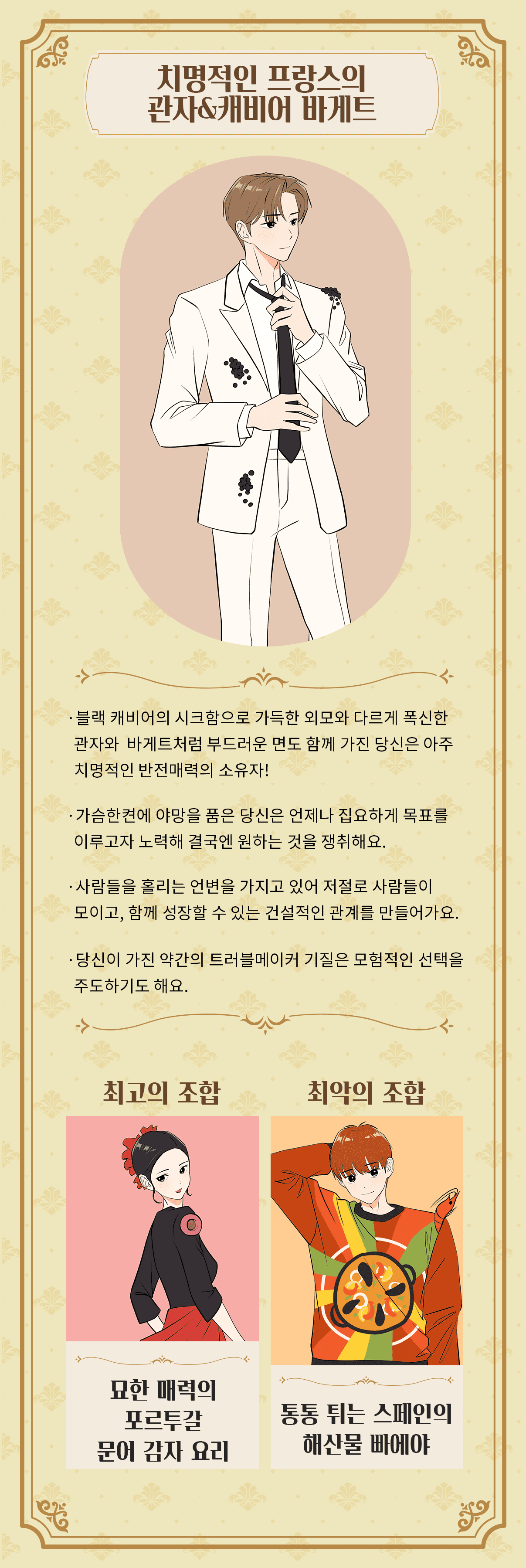 • 블랙 캐비어의 시크함으로 가득한 외모와 다르게 폭신한 관자와 바게트처럼 부드러운 면도 함께 가진 당신은 아주 치명적인 반전매력의 소유자!