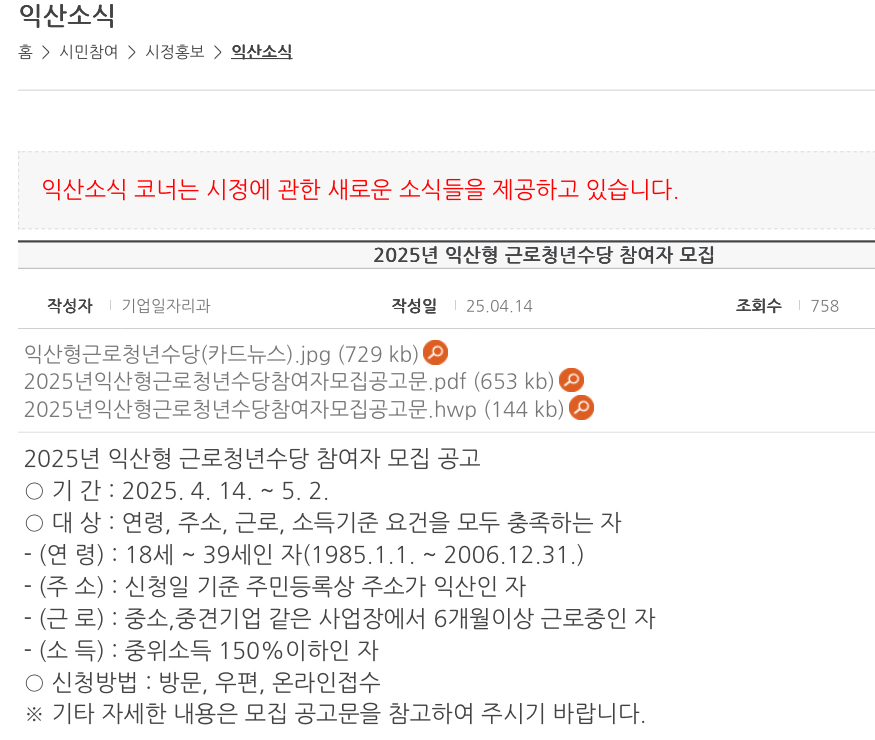 익산형 근로청년수당 모집 대상은 중소·중견기업에서 6개월 이상 재직 중이며, 기준중위소득 150% 이하인 18∼39세 청년이며 2025년 올해 신규 참여자 500명을 모집한다고 합니다.