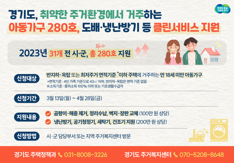 경기도가 주거취약계층을 대상으로 지원해드리는 주거복지는 주택 매매 및 전.월세 계약 시 중개수수료를 보조하는 경기도 부동산 중개보수 지원사업과 열악한 환경에 거주하는 만 18세 미만 저소득 아동가구를 위한 아동주거빈곤가구 클린서비스 지원사업 그리고 비정상 거처 거주자가 적정 거처로 이사할 수 있도록 비정상 거처 거주자 이사비 지원사업이 있습니다.