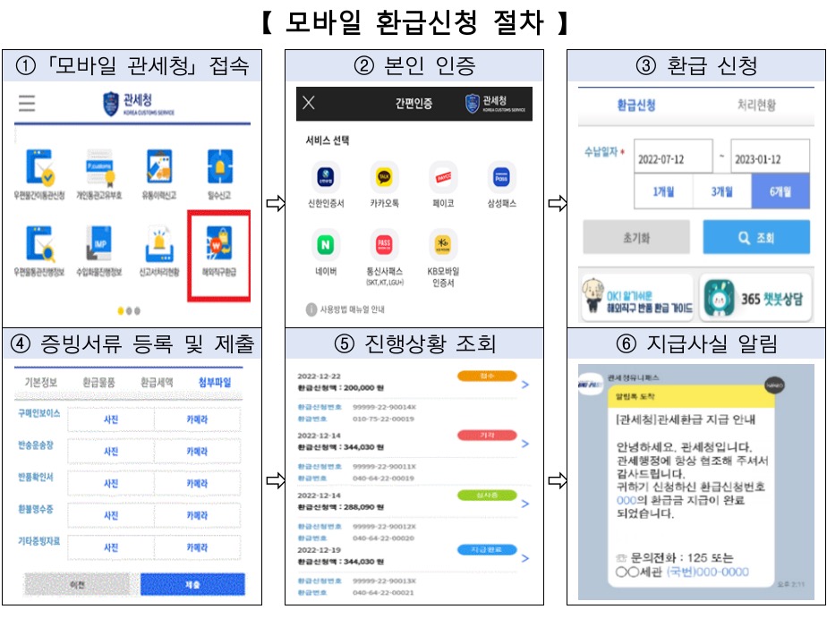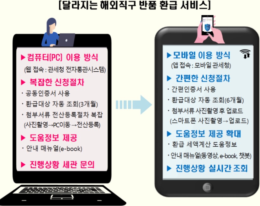 이러한 불편사항을 해소하기 위해, 관세청은 해외직구 이용자가 모바일 기기(앱)를 이용해서도 세금환급을 신청할 수 있도록 하고 세관의 처리 상황을 실시간으로 확인할 수 있도록 했습니다.