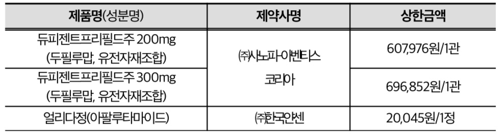 이번 건정심 회의에서는 주요 안건으로 ‘듀피젠트 프리필드 주’ 등 2개 성분 약제(3개 품목)의 요양급여대상 여부 및 상한금액을 결정하였습니다.