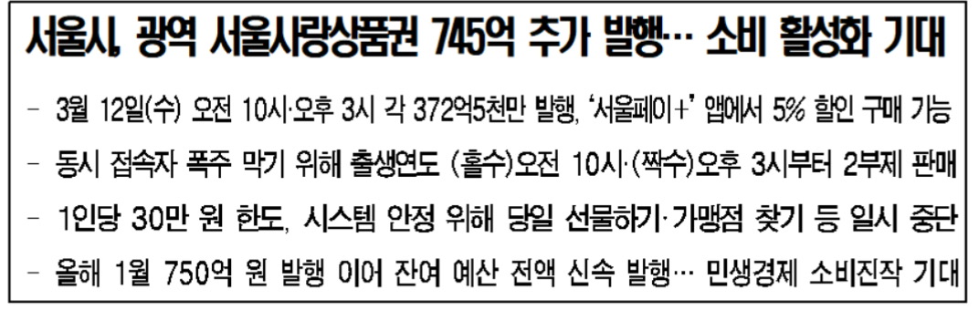 서울시는 경기 침체와 소비 위축이 지속되는 상황에서 소상공인과 골목상권을 적극 지원하기 위해서 2025년 3월 12일 총 745억 원 규모의 ‘서울사랑상품권’을 추가 발행한다고 합니다.