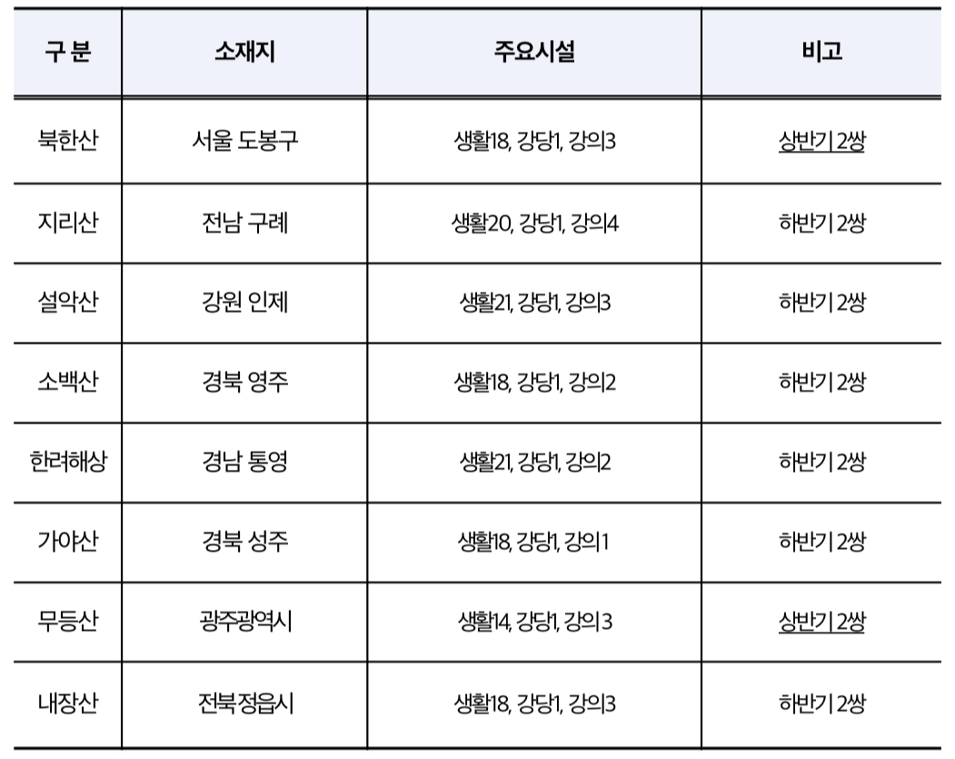지리산 / 전남 구례 / 생활20, 강당1, 강의4 / 하반기 2쌍