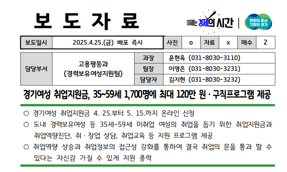 경기도가 경력보유여성 등 35~59세 사이 여성의 취업을 돕기 위한 ‘경기여성 취업지원금’ 사업 참여자 1,700명을 2025년 5월 15일까지 모집한다고 밝혔습니다.