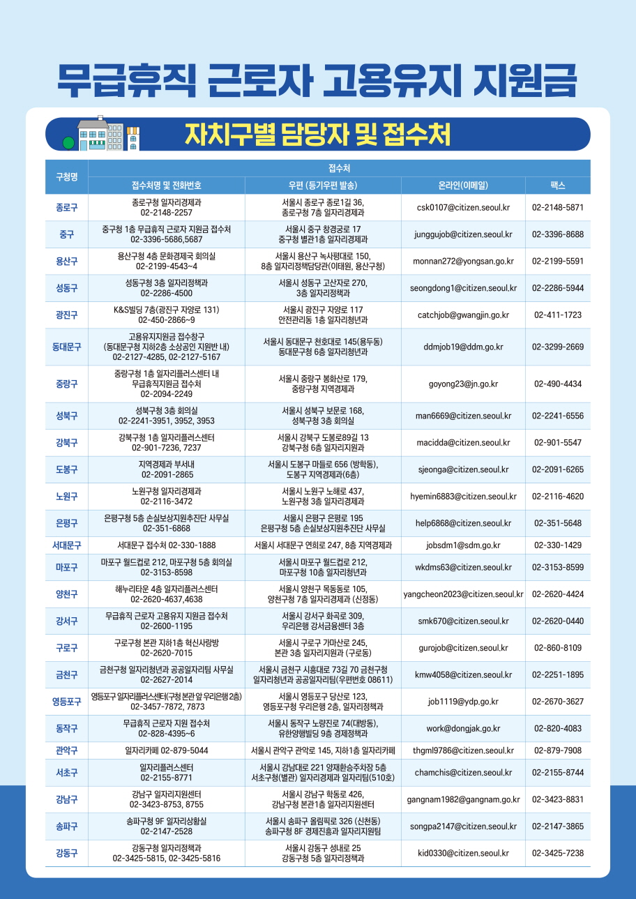 서울시 무급휴직 근로자 고용유지지원금 신청에 관한 더욱 자세한 문의는 각 자치구별 담당자 및 접수처(종로구, 중구, 용산구, 성동구, 광진구, 동대문구, 중랑구, 성북구, 강북구, 도봉구, 노원구, 은평구, 서대문구, 마포구, 양천구, 강서구, 구로구, 금천구, 영등포구, 동작구, 관악구, 서초구, 강남구, 송파구, 강동구)로 문의하시길 바랍니다.