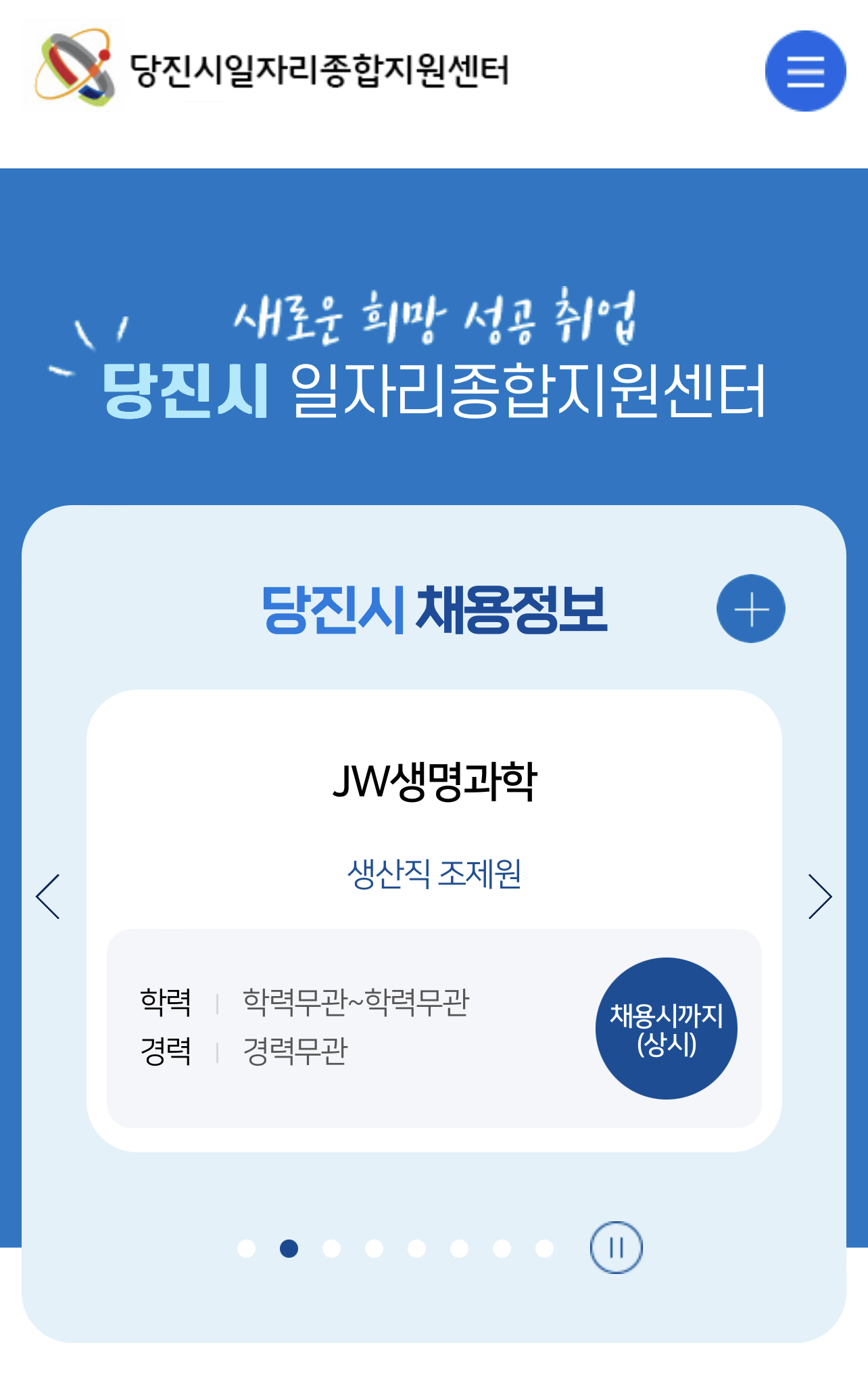 당진시 일자리종합지원센터는 당진시에 관련된 거의 모든 일자리 정보와 그 이외에도 직업교육훈련, 집단상담프로그램, 공공일자리 등 여라가지 일자리 관련 정보를 제공하고 있습니다.